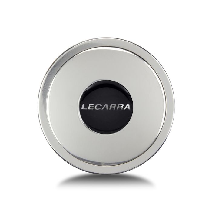 Polished aluminum horn button Lecarra logo Fits Mark 4 and Mark 9 steering wheels Single contact electrical connection Made in USA