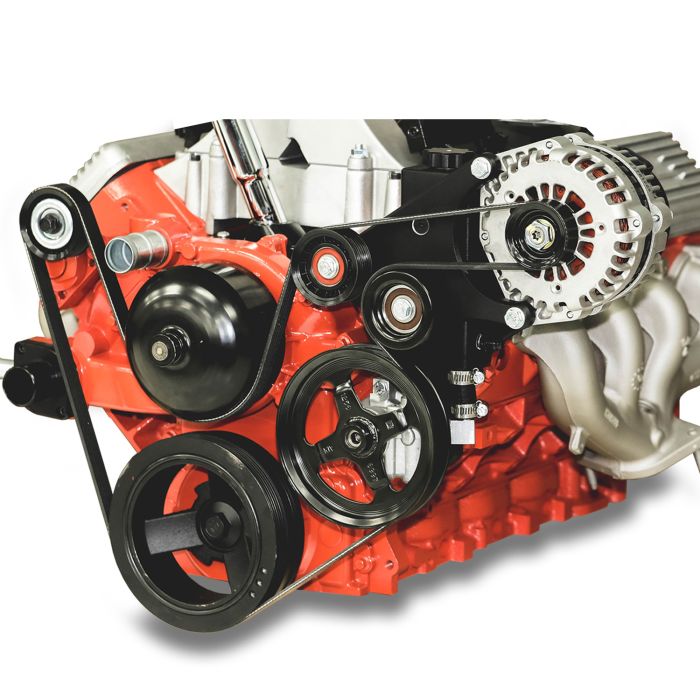 Modern Classic Accessory Drive Kits provide the finishing touch to your vintage look LS engine. The kits utilize a spring loaded tensioner and a single six rib serpentine belt to drive all of your accessories. The kits include high quality, name-brand components and American-made billet aluminum brackets with a semi-gloss black powder coated finish. These kits feature a GM Type II/TC style power steering pump and an integrated, large capacity, remote, billet aluminum reservoir and a 180 amp Powermaster alternator. Kits are designed to work with the truck belt line using an early F-body water pump. Kits do not include the F-body water pump or truck balancer.