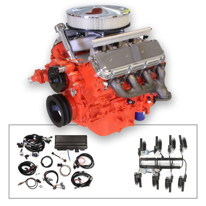 14" Classic Crate Engine, LS3 495 HP, painted orange with chrome BB Chevy Valve