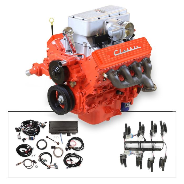 63 Fuelie Crate Engine, LS3 495 HP, painted orange with orange SB Chevy Valve Co