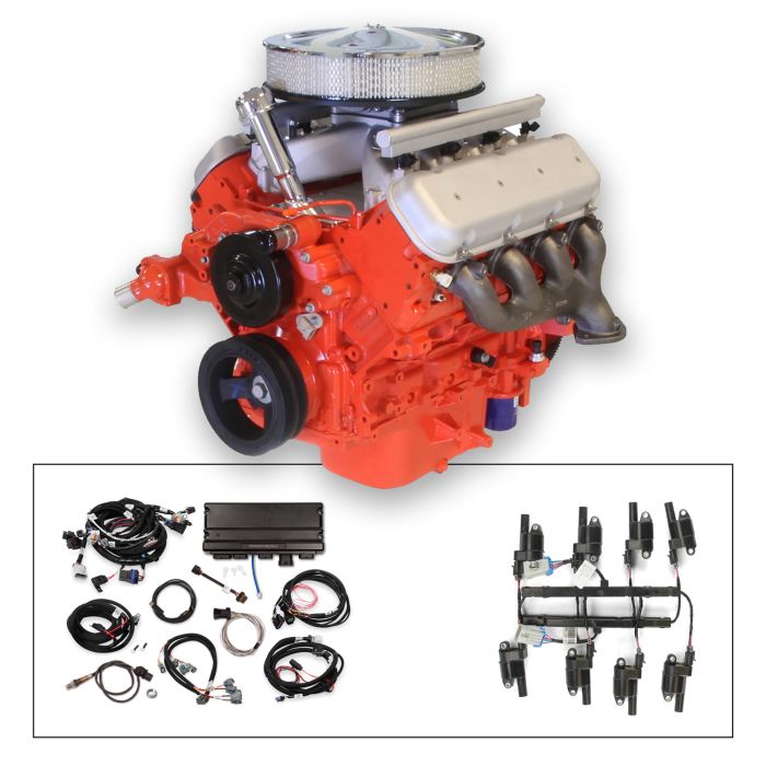 14" Classic Crate Engine, LS3 495 HP, painted orange with cast finish BB Chevy V
