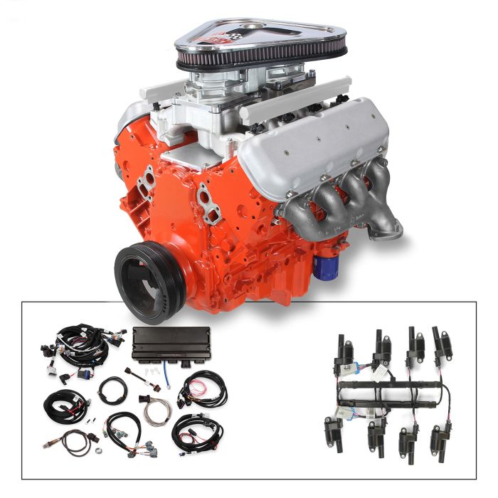 Tri-Power Crate Engine, LS3 495 HP, painted orange with cast finish BB Chevy Val
